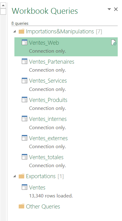 Dans mon exemple, je dois d’abord importer une source de données de ventes web, une source de données de ventes de partenaires, une source de données de ventes de services et une source de données de ventes de produits. Ensuite, je dois utiliser l’option de fusion “Append” pour obtenir les ventes internes (services et produits) et les ventes externes (web et partenaires). Finalement, je dois utiliser à nouveau l’option “Append” pour fusionner les ventes internes et les ventes externes, afin d’obtenir les ventes totales. Toutes ces requêtes sont en mode “connexion seulement”. Je retournerai à ces requêtes seulement si je dois éventuellement faire des ajustements aux étapes de transformations sous-jacentes. Autrement, je pourrai grouper le dossier, de façon à voir plus clair dans mes requêtes.