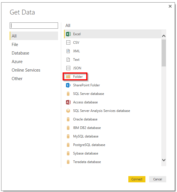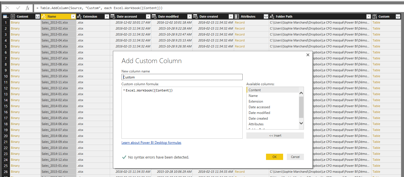 Avant la mise à jour de novembre dernier, il était possible de combiner les fichiers Excel d’un dossier en important d’abord le metadata des fichiers du dossier via l’option Folder (Dossier) et en utilisant ensuite la fonction Excel.Workbook, tel qu’illustré ci-dessous.