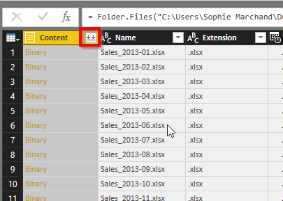 Utiliser la fonction Excel.Workbook([Content]) pour extirper le contenu de chacun des fichiers du dossier.