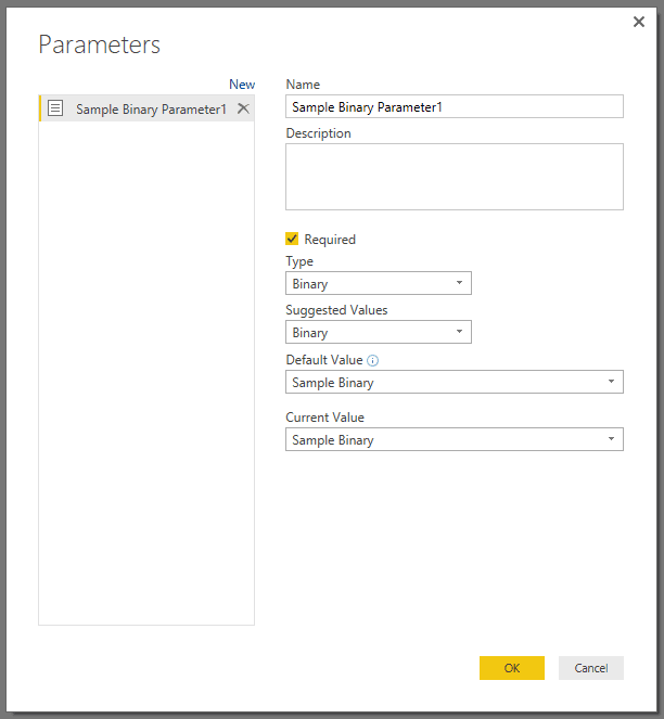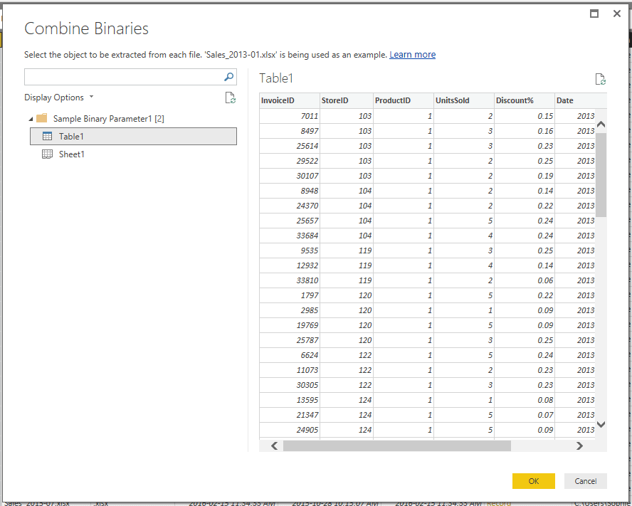 Le Sample Binary est tout simplement la valeur utilisée par le paramètre au moment où vous le consulter. Nous pouvons constater ici qu’il s’agit du fichier Sales_2013-01.xlsx.