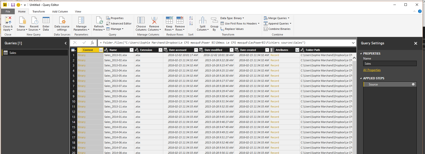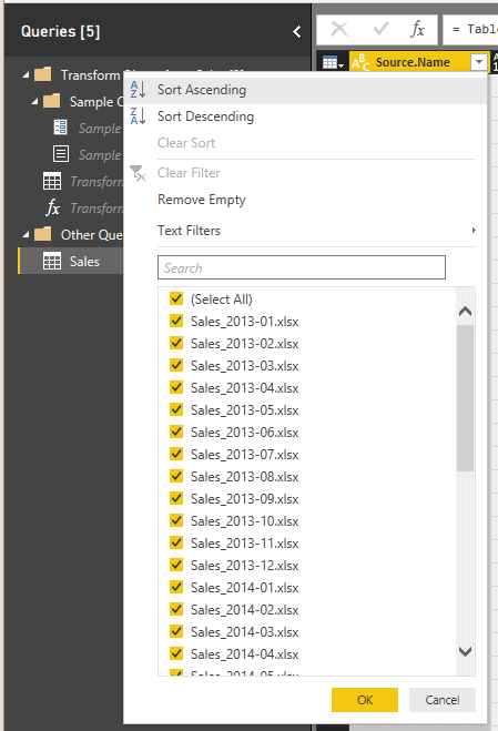 Le dossier Other Queries ne contient qu’une requête, qui se nomme Sales. Si vous cliquez sur le menu déroulant de la colonne Source.Name, vous observerez que tous les fichiers Excel ont été importés.