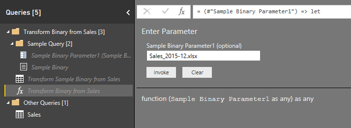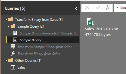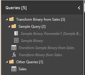 Vous observerez, dans le panneau de requête, que Power BI utilise la nouvelle façon de créer les fonctions pour vous présenter le résultat. Pour en savoir plus sur cette nouvelle façon de faire, vous pouvez relire l’article Power BI: La nouvelle façon de créer des fonctions. Ci-dessous, notez un dossier qui se nomme Transform Binary from Sales et un autre qui se nomme Other Queries.