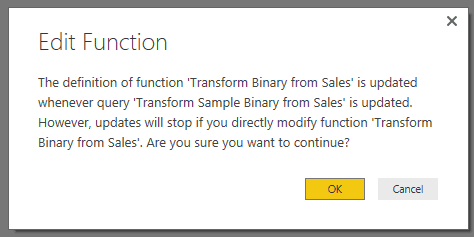 En supposant maintenant que vous souhaitiez effectuer des transformations sur les fichiers Excel avant de les combiner, vous pourriez le faire en modifiant la requête Transform Sample Binary from Sales. En effet, tel qu’expliqué dans l’article Power BI: La nouvelle façon de créer des fonctions, vous ne devriez pas modifier directement la fonction Transform Binary from Sales. Voici d’ailleurs le message d’avertissement que vous recevrez si vous tentez de modifier directement la fonction.