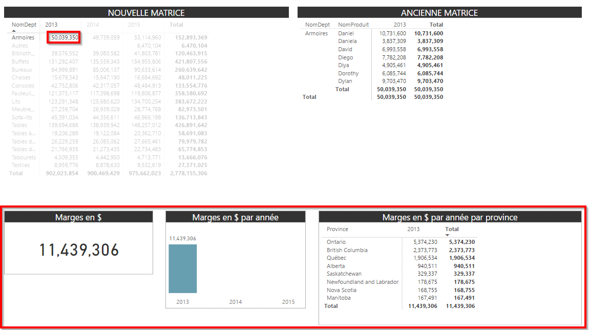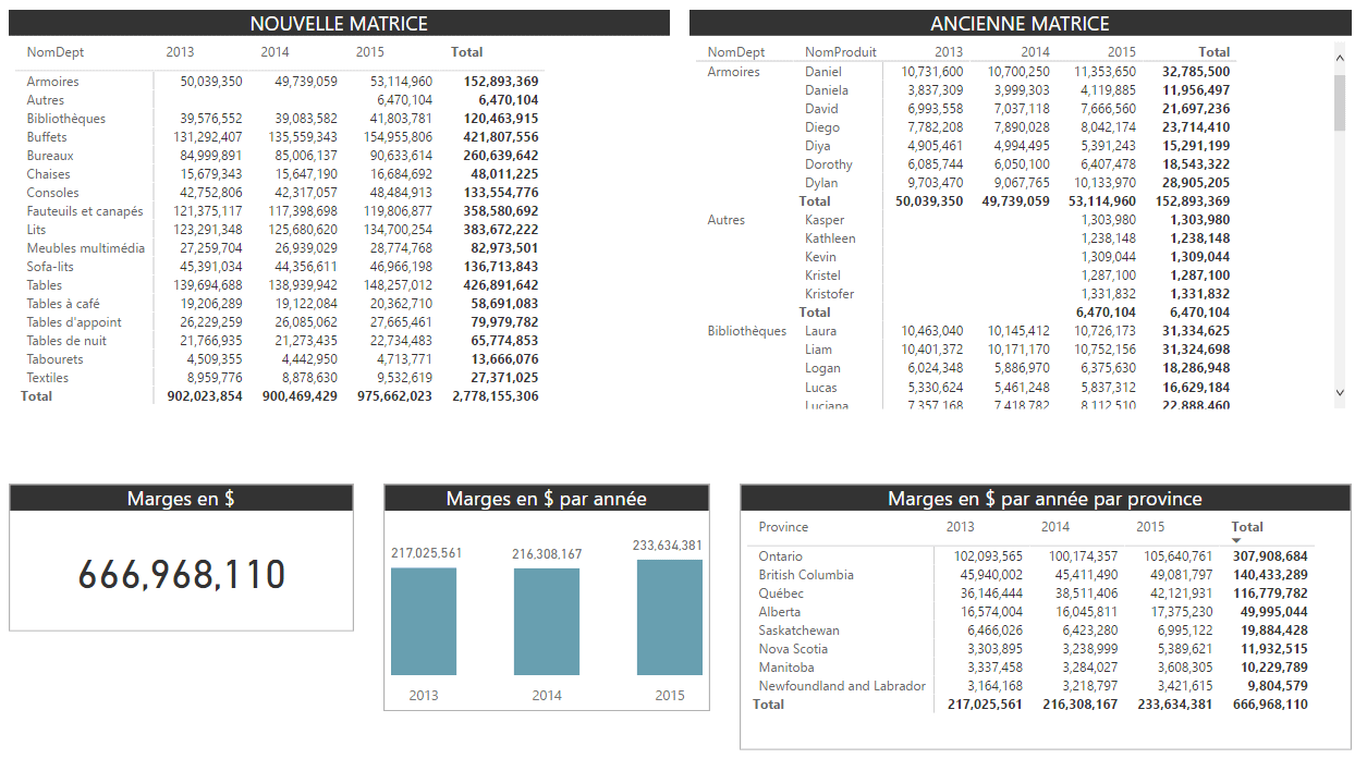 Afin de comparer la nouvelle matrice avec l’ancienne, nous allons travailler avec les deux visuels de matrices ci-dessous. Notez que nous avons également inséré 3 autres tuiles, pour vous présenter les options d’interaction entre la nouvelle matrice et les autres tuiles d’un rapport. Déjà, au premier coup d’œil, on peut apercevoir que la nouvelle matrice présente les ventes par département, alors que l’ancienne présentement les ventes par produit, par département.
