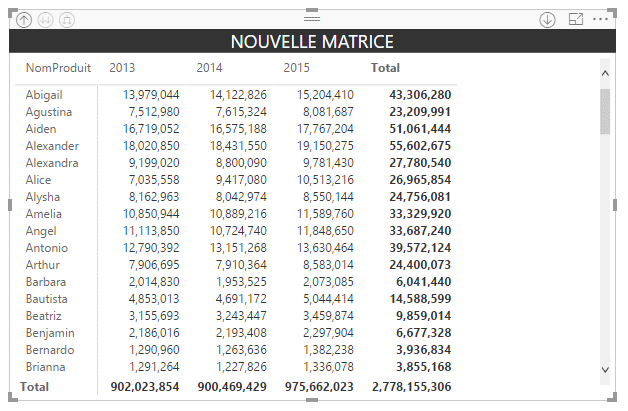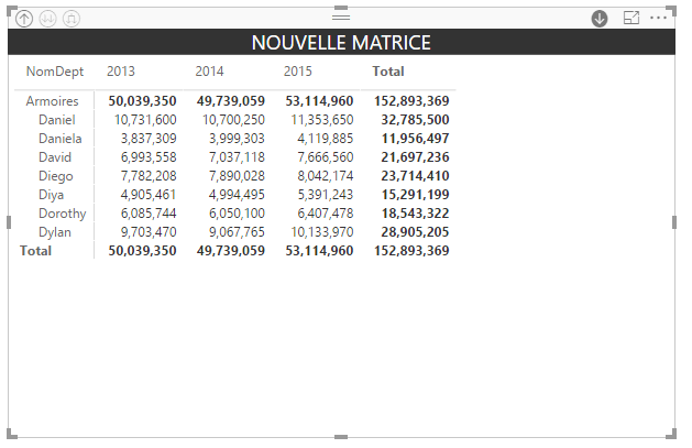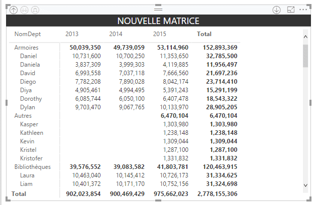 En cliquant sur les doubles flèches liées, je suis en mesure de présenter les ventes brutes par département, puis par produit, comme dans l’ancienne matrice.