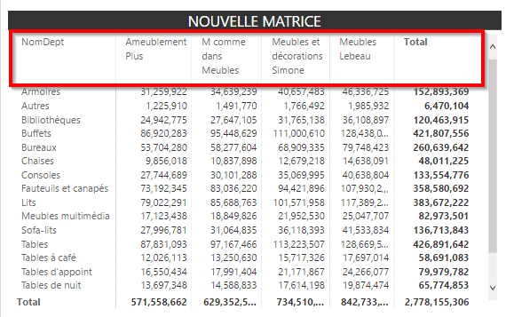 En activant la flèche unique, je peux ensuite cliquer sur une étiquette de lignes de la matrice. Ci-dessous, j’ai cliqué sur Armoires et j’ai obtenu le détail des armoires, par produit.