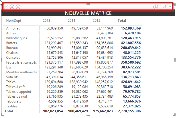 À noter que lorsque je clique sur une des valeurs de la matrice, par exemple sur le montant de ventes brutes des armoires, toutes les autres tuiles de mon rapport se mettent à jour en conséquence.