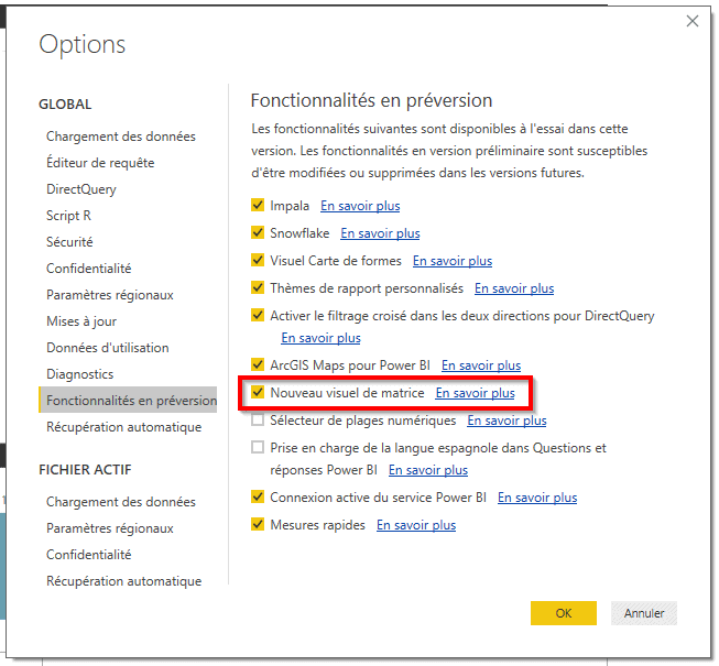 Pour activer des fonctionnalités en préversion, dans Power BI, vous devez aller dans le menu File/Options/Fonctionnalités en préversion. Dans cet article, nous allons utiliser le nouveau visuel de matrice.
