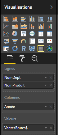 Dans le panneau de visualisations, nous avons utilisé les ventes brutes comme valeur et nous avons placé les années dans les colonnes. Finalement, nous avons utilisé deux champs pour les étiquettes de lignes, soit les noms de départements et les noms de produits.