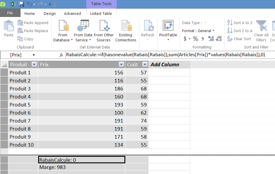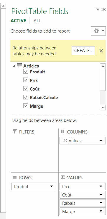 Ensuite, dans le tableau croisé dynamique, on peut sélectionner les éléments de notre table initiale (Produit, Prix et Coût), en plus des deux mesures calculées (Rabais calculé et Marge). À noter qu’on ne crée pas de relation entre la table de segments et la table de faits.