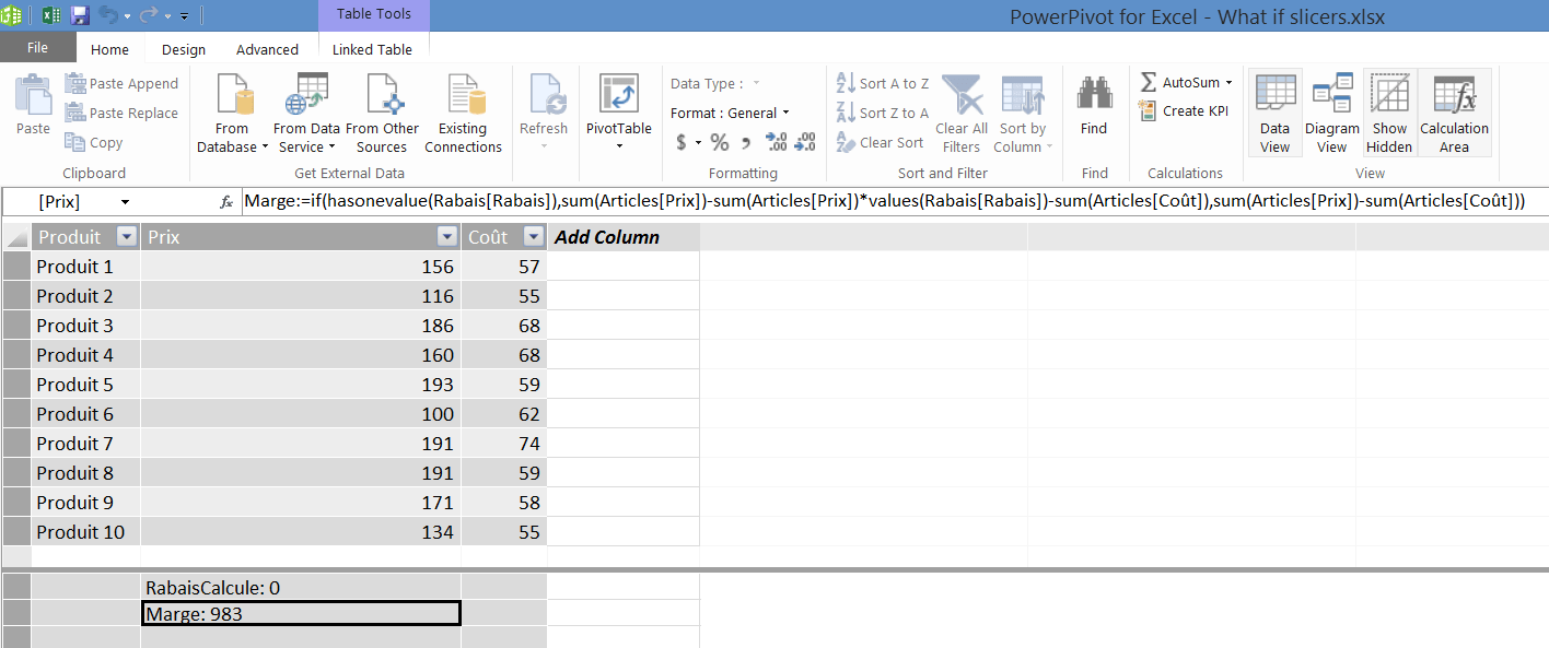 Pour obtenir le résultat ci-dessus, il est nécessaire de définir d’abord quelques mesures en DAX, dans Power Pivot. D’abord, il faut définir une mesure de rabais. Lorsqu’un utilisateur choisira un taux de rabais via les segments, cette mesure devra rapporter le montant du rabais. La formule DAX suivante doit se lire comme suit : Si une option de rabais a été sélectionnée dans le segment (if…hasonevalue…), prendre le prix et le multiplier par le rabais sélectionné, sinon, afficher 0.