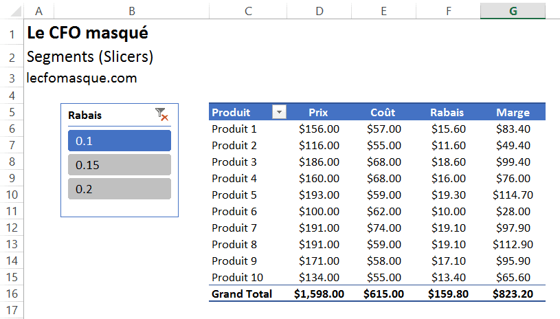Il est possible de créer des segments dans Excel, comme ces options de taux de rabais ci-dessous, afin de calculer certaines mesures, comme la marge. Ceci permet ensuite à l’usager d’effectuer une analyse de scénarios à partir de segments Excel.