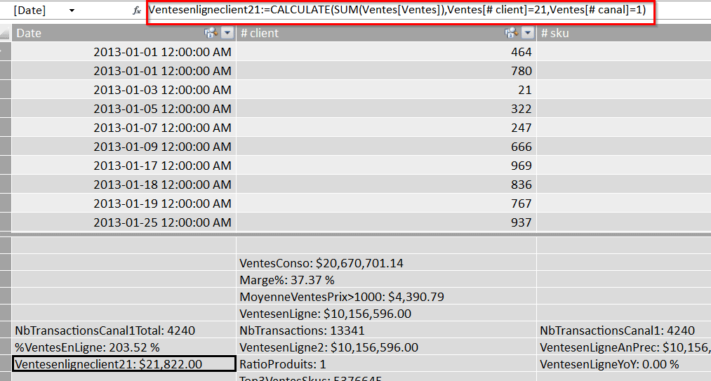 Évidemment, il est aussi possible d’utiliser plus d’un filtre dans une fonction CALCULATE. Par exemple, ci-bas, nous effectuons la somme des ventes pour le client 21,dans le canal 1, i.e. les ventes en ligne. Nous utilisons donc deux filtres.
