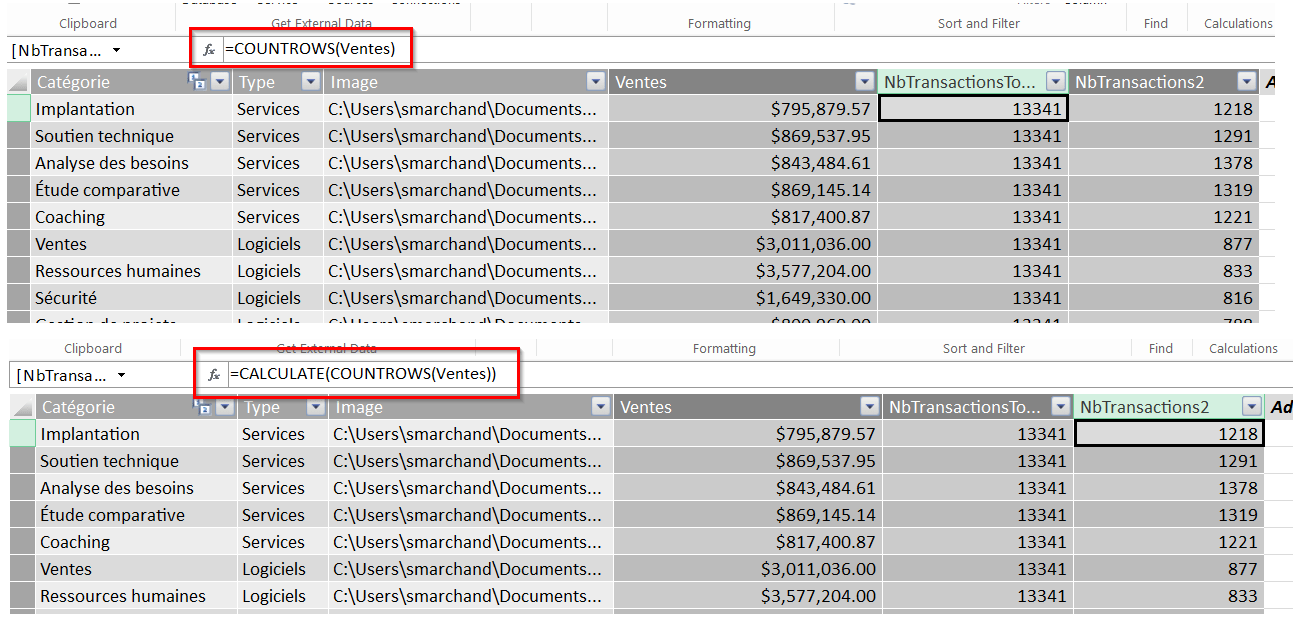 Dans l’article Power Pivot: Leçon de DAX no.3 (COUNTROWS), nous avons vu comment utiliser la fonction DAX COUNTROWS. Dans le premier exemple, ci-bas, nous l’utilisons notamment pour calculer le nombre de transactions total dans la table de ventes et le résultat est inscrit dans une colonne de la table Catégories. Ainsi, pour chaque catégorie, nous obtenons un nombre de 13,341 transactions. Ce chiffre est stable puisqu’il représente le nombre de transactions total, sans égard aux catégories, dans la table de ventes. Dans le deuxième exemple ci-bas, nous affichons plutôt le nombre de transactions par catégorie, par le biais de la fonction CALCULATE. Nous déplaçons ainsi le contexte de lignes en contexte de filtres.