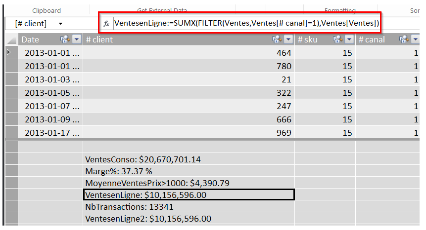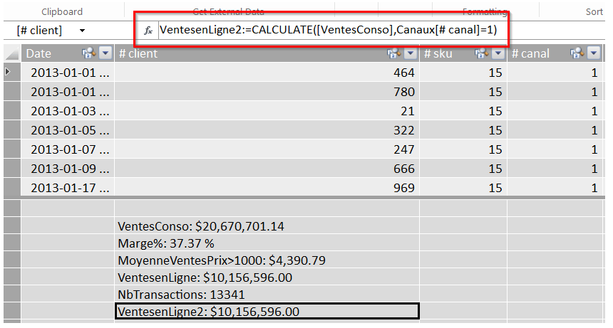 Dans l’exemple suivant, nous utilisons la fonction CALCULATE pour calculer les ventes en ligne, soit les ventes du canal #1. Nous aurions également pu écrire cette fonction de la façon suivante: CALCULATE(SUM([Ventes]Ventes),Canaux[# canal]=1), mais nous avions déjà défini [VentesConso] comme étant SUM([Ventes]Ventes).