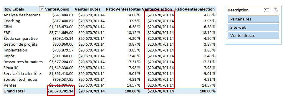 - Les ventes (filtrées par les lignes du tableau croisé dynamique, i.e les catégories)