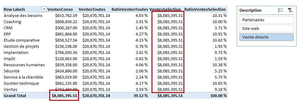 - Le ratio représentant le pourcentage des ventes de chacune des catégories par rapport aux ventes totales est affecté au niveau du numérateur (ventes par catégorie, filtrées pour les ventes directes) mais demeure inchangé au niveau du dénominateur (ventes totales)