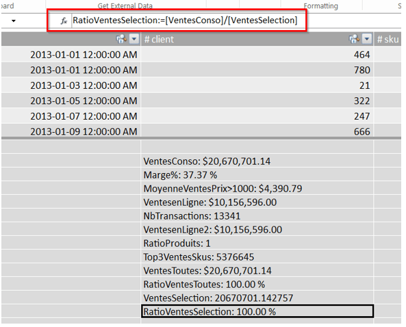 - Le ratio représentant le pourcentage des ventes de chacune des catégories par rapport aux ventes sélectionnées dans le segment (slicer)