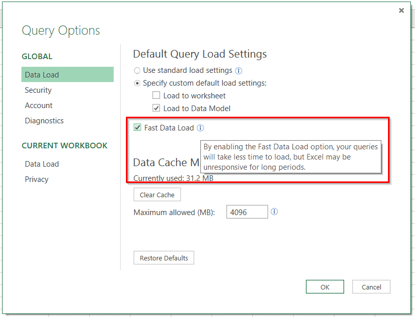 D’abord, sous Data Load, vous pouvez utiliser les options de téléchargement par défaut ou préciser ce que vous préférez. Vous avez notamment l’option de cocher la case Fast Data Load. On explique que cette option permet de charger les requêtes plus rapidement, mais que, ce faisant, il se pourrait qu’Excel soit hors d’usage pour toute la période de téléchargement/rafraîchissement.