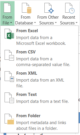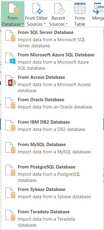 Power Query d’importer des données de différentes bases de données (SQL Sever, Microsoft Azure SQL, Access, Oracle, IBM DB2, MySQL, PostgreSQL, Sybase, Teradata).