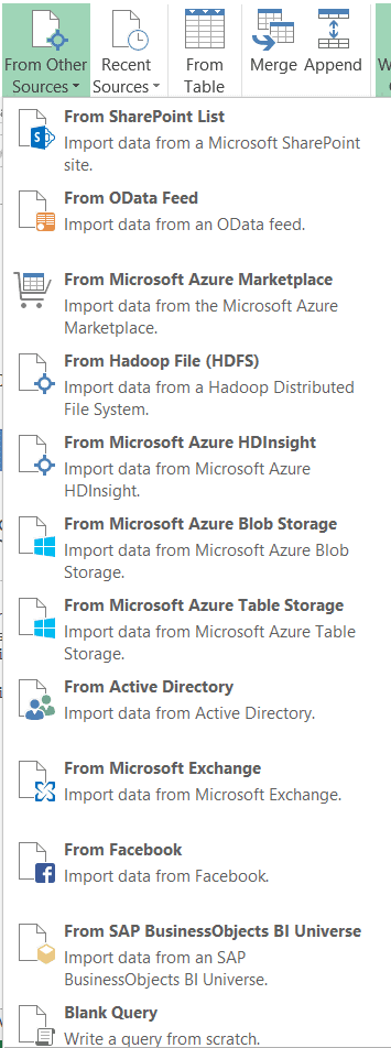 Finalement, Power Query permet d’importer des données d’une multitude d’autres sources, tel qu’illustré ci-bas et Microsoft ajoute régulièrement de nouvelles options. À suivre!