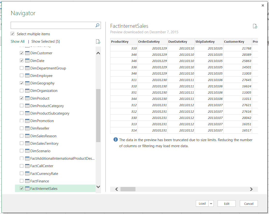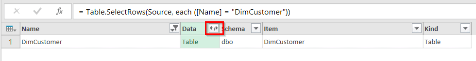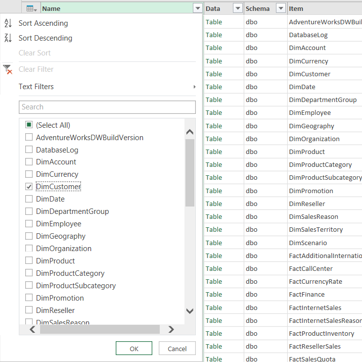 Ce faisant, si nous souhaitons procéder avec la balance de la requête pour extirper la dimension Customer, nous n’avons qu’à effectuer un filtre pour sélectionner DimCustomer dans la liste des noms de tables, tel qu’illustré ci-dessous.