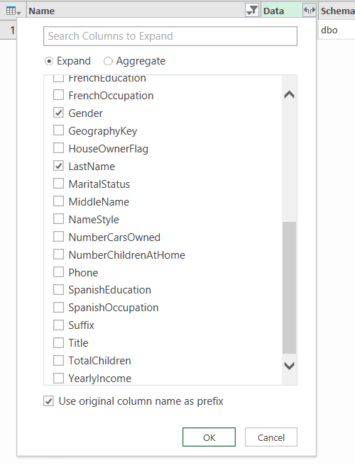 Ensuite, nous pouvons utiliser le menu d’expansion pour choisir seulement les colonnes qui nous intéressent pour notre modèle, le cas échéant.