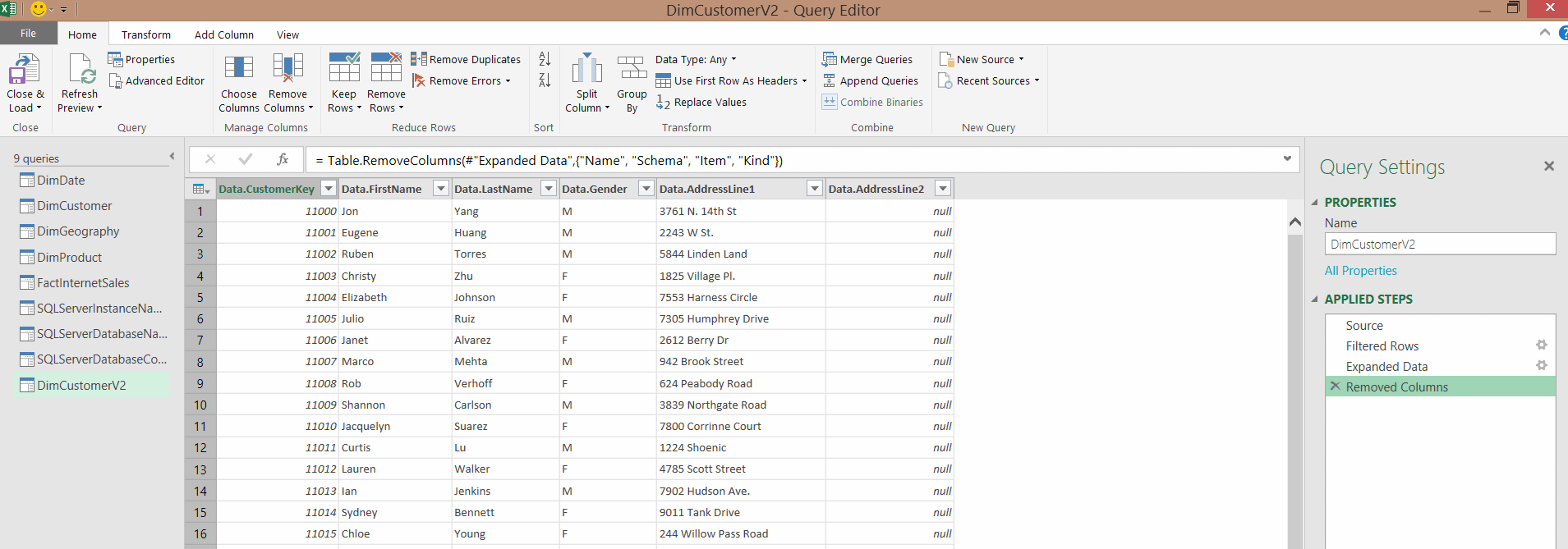 Finalement, notre requête DimCustomerV2 est plus légère que la première (puisque nous n’avons retenu que les colonnes nécessaires à notre analyse). De plus, elle se réfère à la source SQLServerDatabaseConnection, ce qui nous permet de ne pas dédoubler les informations de connexion dans les autres requêtes et ce qui permet également de changer la source aisément, au besoin.