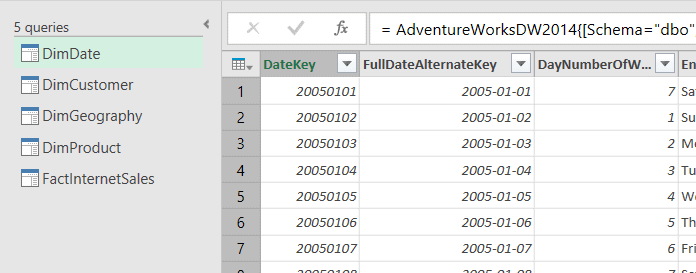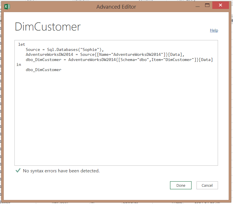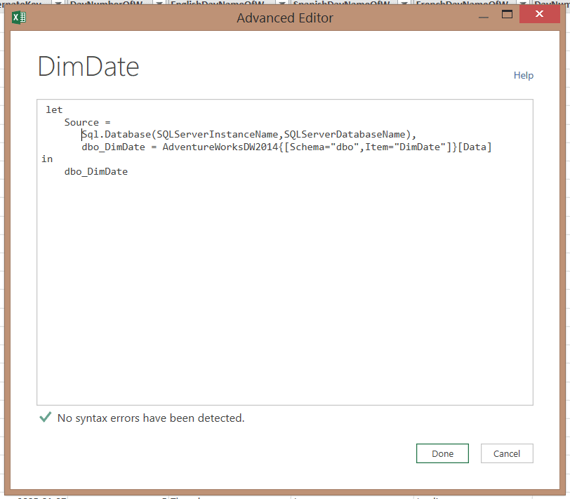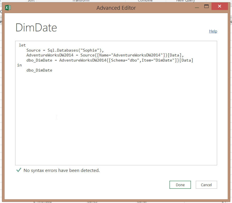 Quand on ouvre la requête DimDate (via le Advanced Editor), on s’aperçoit qu’il y a d’abord une connexion qui se crée sur le serveur SQL Sophie et, plus précisément, sur la base de données AdventureWorksDW2014 et, finalement, sur la table DimDate.