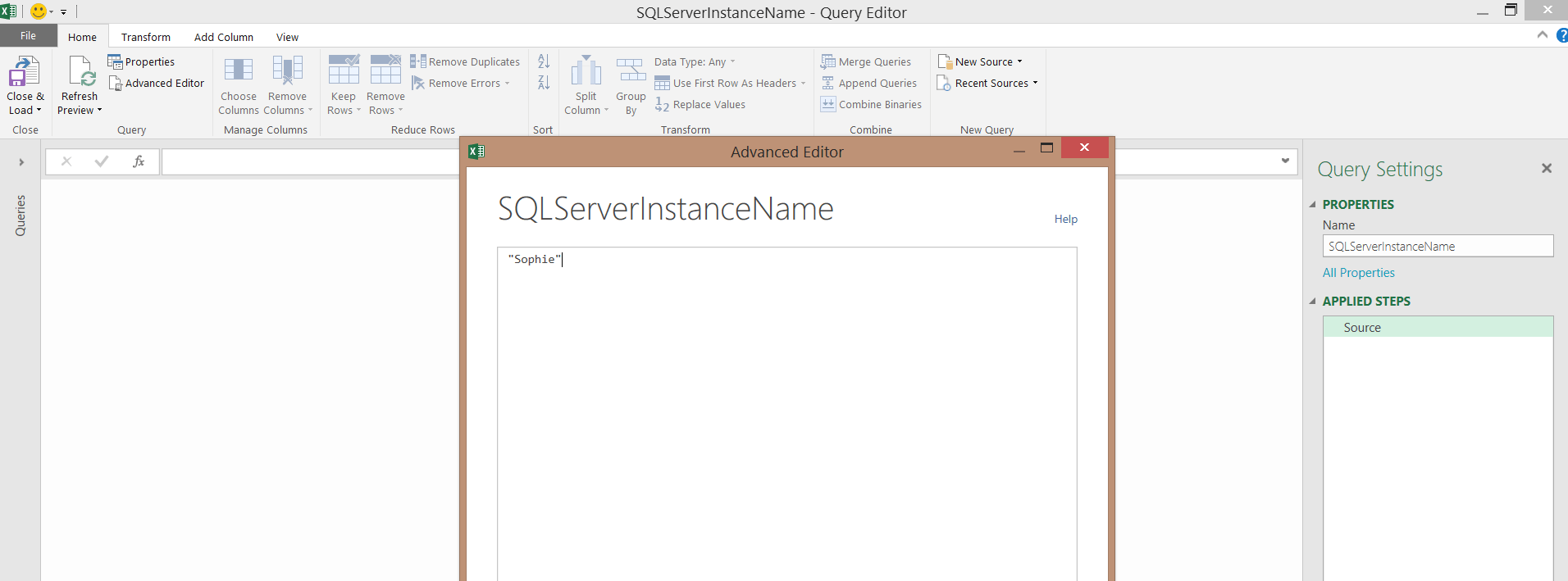 Pour contourner ce problème, Chris Webb propose d’abord de créer une requête vierge (from blank) qui ne comprend que le nom du serveur, et de nommer cette requête SQLServerInstanceName.
