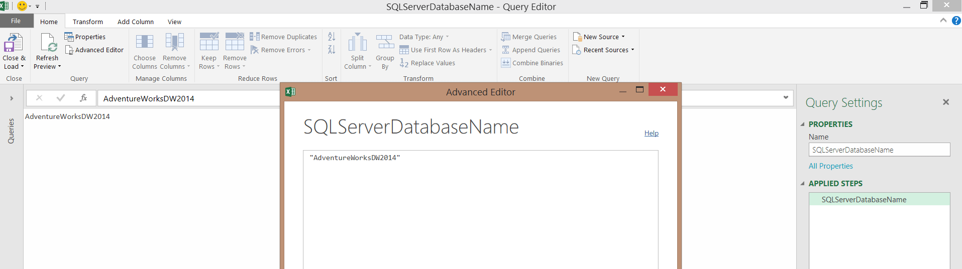 Une deuxième approche, inspirée de la première, serait de créer une requête qui effectue réellement la connexion à la source de données, et de nommer cette requête SQLServerDatabaseConnection.