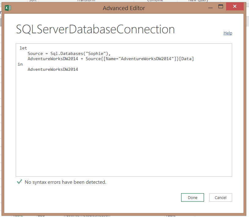 La première approche que j’aimerais vous présenter est expliquée en détails dans un article de Chris Webb, Avoiding Duplication Of Database Connection Information In Power BI. En voici un résumé.