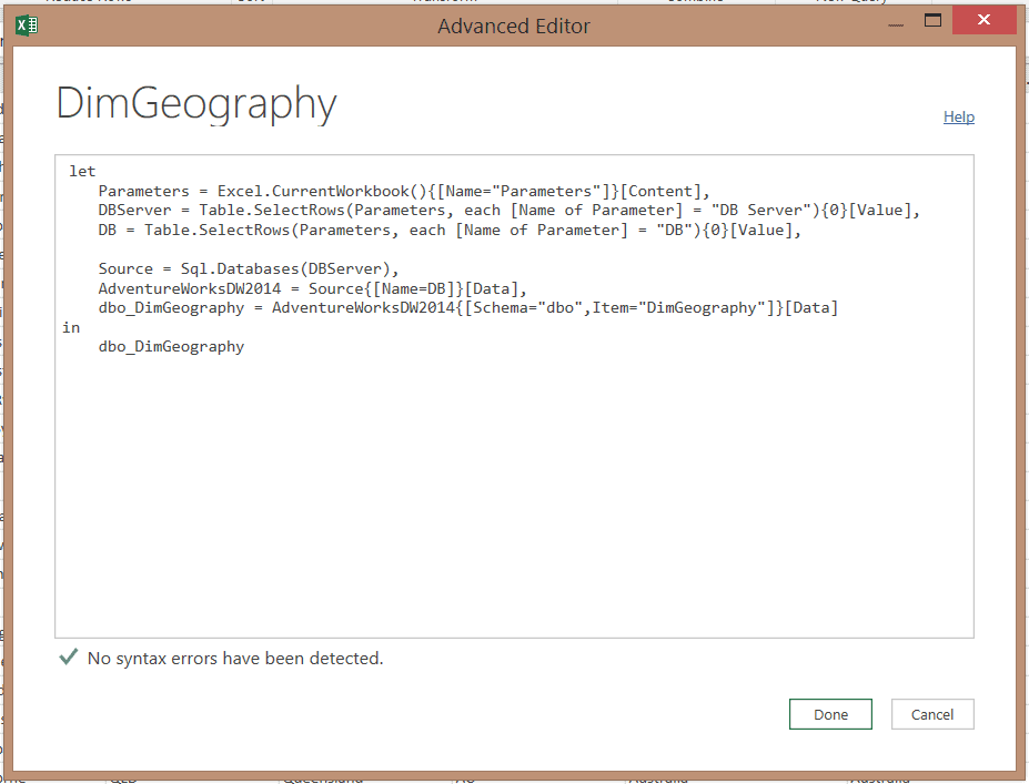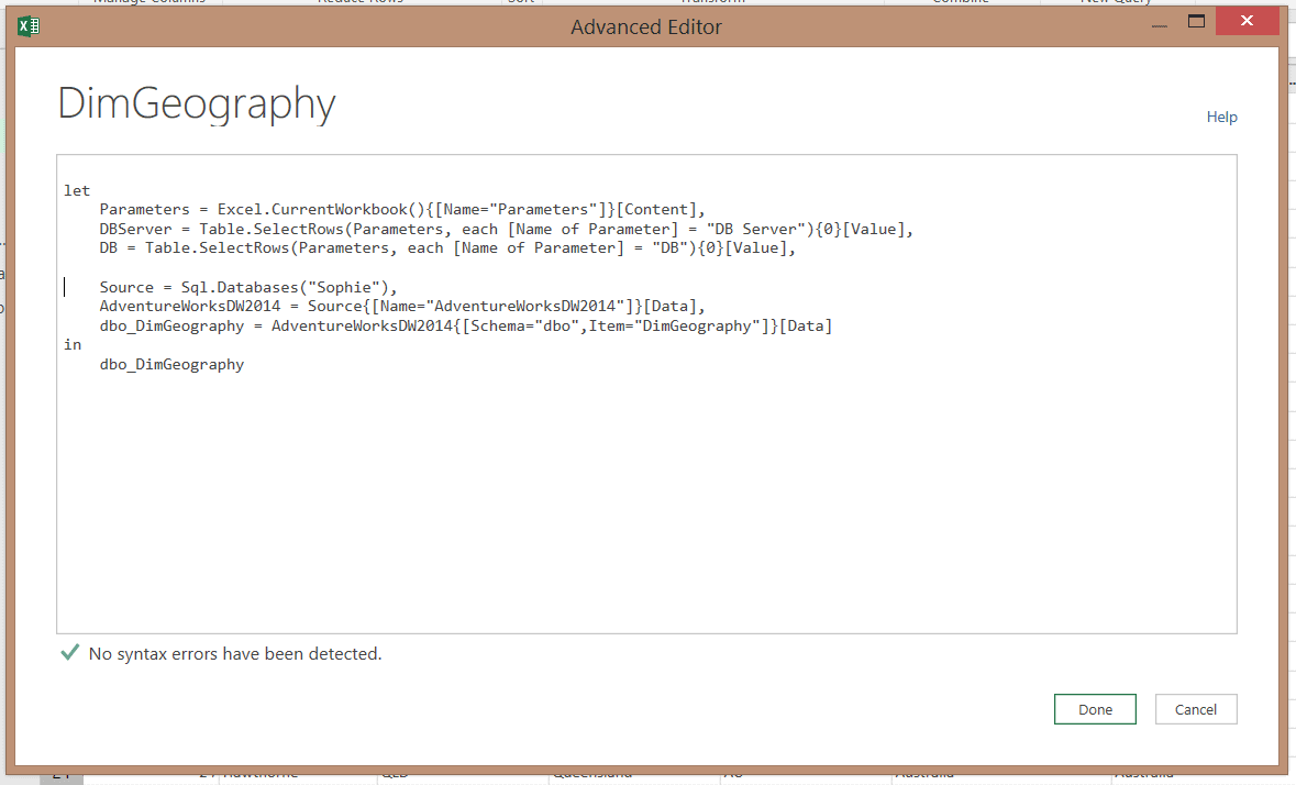 Une troisième approche pourrait être utilisée dans Power Query pour Excel (mais pas dans Power Bi Desktop). Il s’agirait d’insérer les paramètres de connexion dans Excel et de les utiliser pour passer des paramètres dans Power Query.