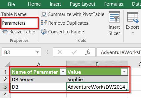 Il s’agit d’abord de créer une table avec les informations de connexion, la mettre sous forme de tableau et lui donner un nom, Parameters, dans l’exemple ci-bas.