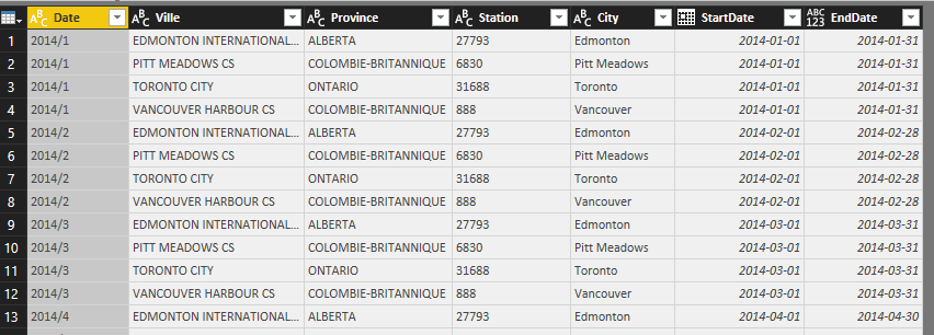 Il m’a ensuite fallu m’assurer d’avoir toutes les informations nécessaires pour reconstruire tous les url me permettant d’aller chercher les données météos mensuelles de toutes ces combinaisons possibles. J’ai d’abord utilisé les fonctionnalités de dates pour me créer un “StartDate” et un “EndDate” par mois.