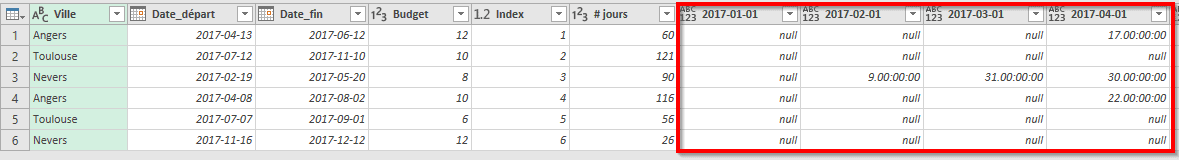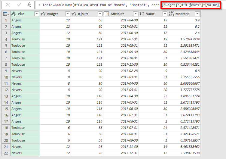 Nous avons finalement ajouté une colonne calculée afin d’obtenir le budget du mois en question, en fonction du nombre de jours couverts dans le mois.