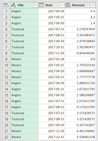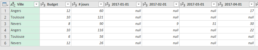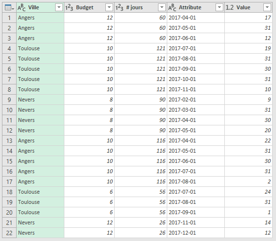 Par la suite, nous avons “dé-pivoté” les colonnes (unpivot columns) pour obtenir le résultat suivant.