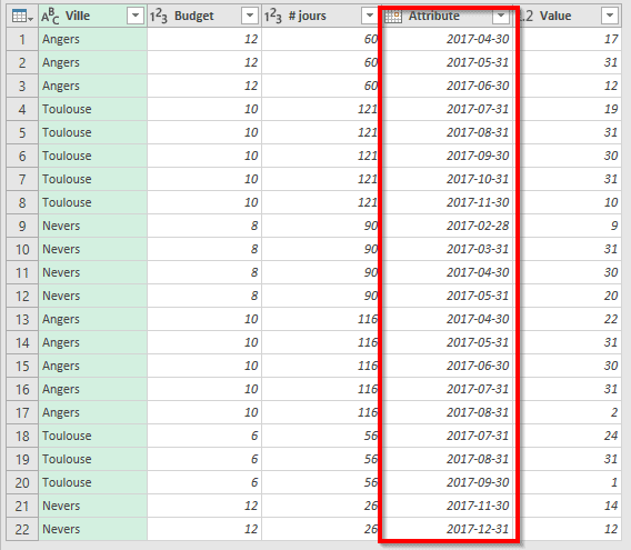 Nous avons ensuite appliqué le format de dates à notre colonne “Attribute” et nous l’avons transformée en date de fin de mois.