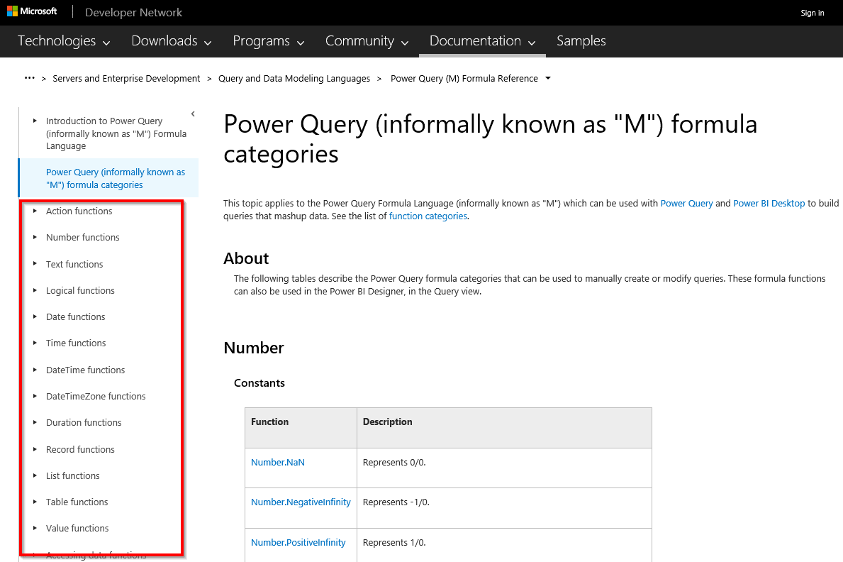 Vous serez d’abord redirigé vers une page d’information sommaire et ensuite vous pourrez cliquer sur Power Query formula categories pour aboutir sur la page ci-dessous. Vous pourrez d’abord cliquer sur une catégorie de fonctions, dans la marge à gauche et ensuite cliquer sur la fonction désirée, au centre de la page.