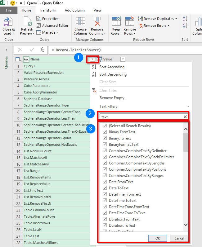 Par la suite, vous pourrez utiliser le menu déroulant (1) pour effectuer des recherches (2). Par exemple, si vous recherchez une fonction texte, vous pouvez écrire “text” et ensuite cocher (3) la fonction qui vous semble appropriée.