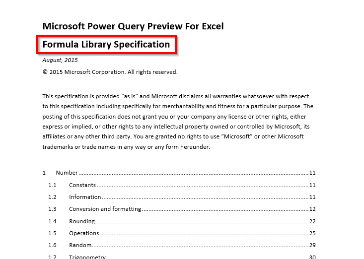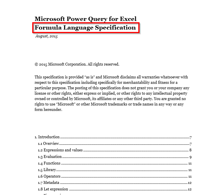 Ensuite, on retrouve le document Formula Language Specification qui explique les concepts entourant le code M et les règles à respecter pour savoir comment en tirer profit.