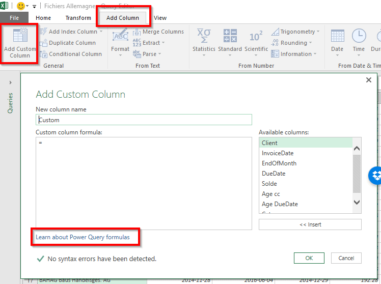 Il existe une deuxième façon d’obtenir de l’aide sur le code M, à partir de Power Query. Il s’agit d’ajouter une colonne personnalisée et vous verrez dans le bas de la fenêtre de dialogue, la mention “Learn about Power Query formulas”.