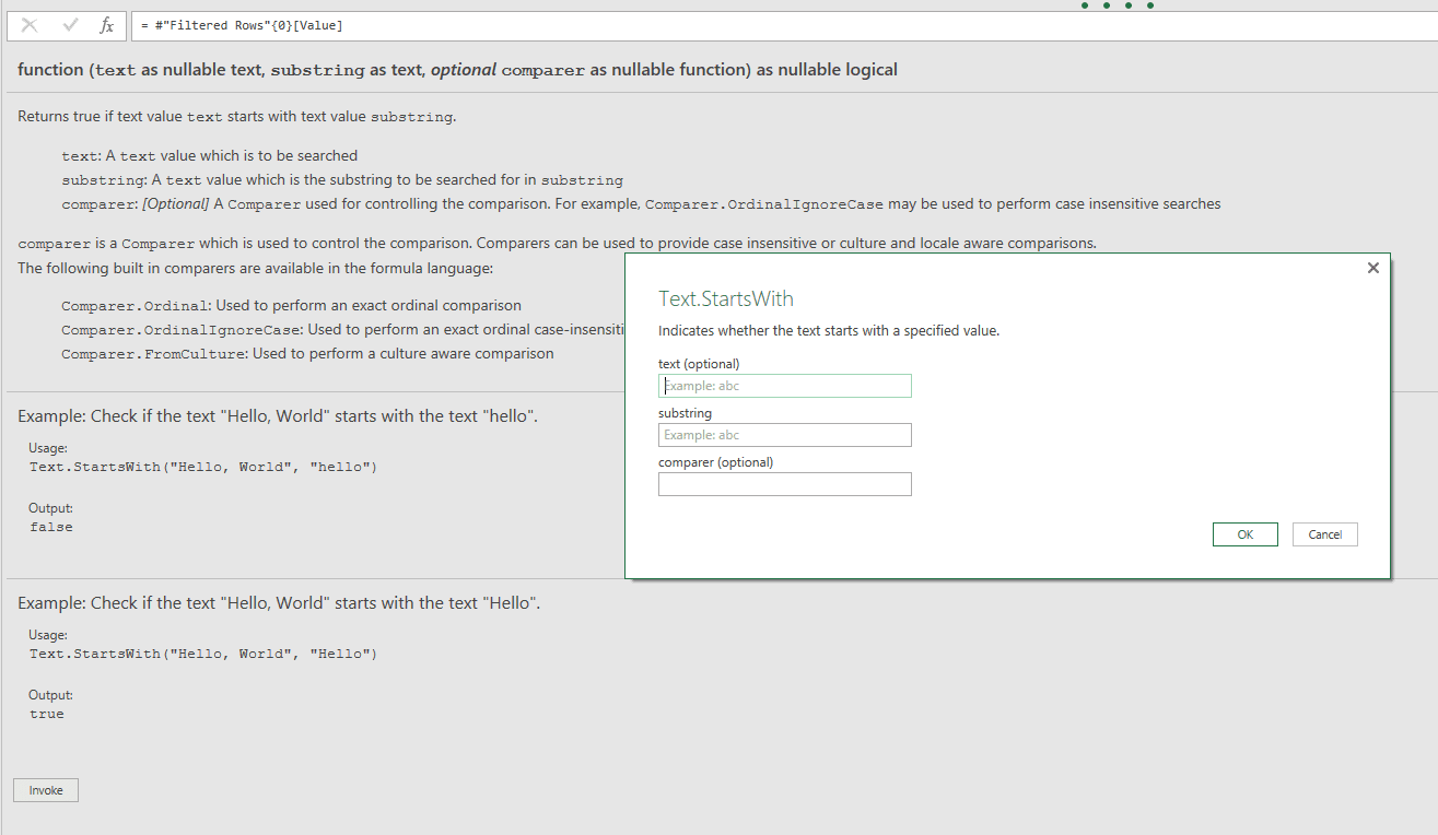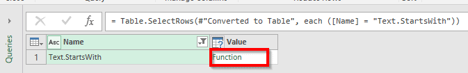 Dans l’exemple ci-dessous, je me suis arrêtée sur la fonction Text.StartsWith. J’ai ensuite pu cliquer sur “Function”.