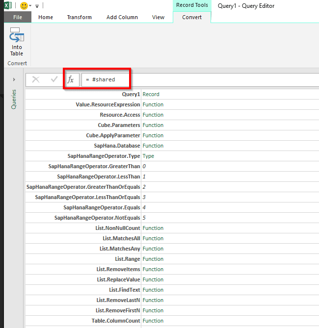 La façon sans doute la plus efficace d’obtenir une assistance immédiate pour rédiger votre code M se trouve à l’intérieur même de Power Query. En effet, vous pouvez insérer une requête vide dans Power Query et ensuite vous rendre dans la barre de formules et inscrire =#shared (tel qu’illustré ci-dessous).