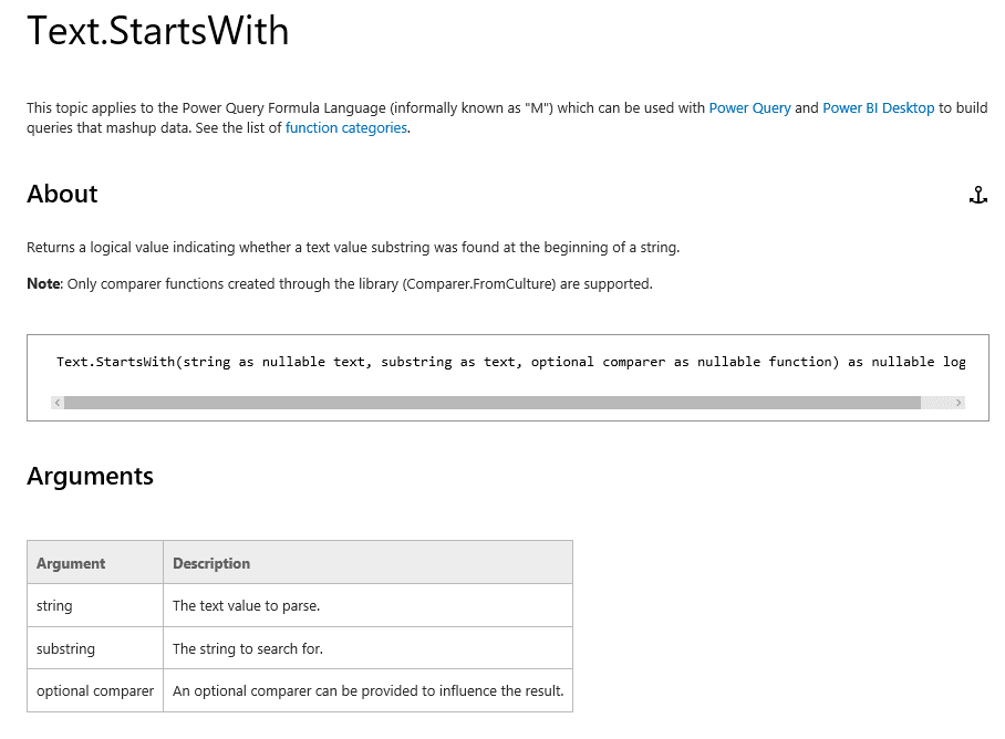Pour poursuivre avec le même exemple, si vous cliquez sur la fonction Text.StartsWith, vous obtiendrez l’information suivante, un peu moins exhaustive que celle que l’on retrouve à l’intérieur de Power Query: