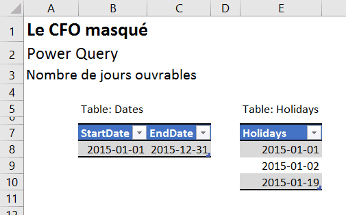 Pour effectuer ma démonstration, je vais utiliser les tables Dates (qui contient la date de début et la date de fin de la période sous analyse) et Holidays (qui contient les jours fériés).