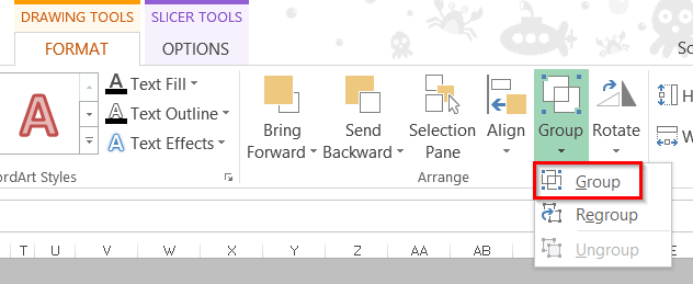 À ce moment là, vous verrez apparaître un menu Outils de dessin (Drawing tools) dans votre barre de menus. Choisissez l’option Grouper (Group).