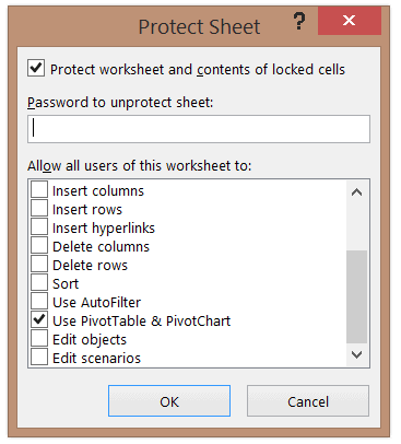 Nous avons déjà vu dans un article précédent comment protéger un onglet dans Excel (article: Truc Excel: Protégez vos données). Sachez que vous pouvez cocher l’option “Utiliser les tableaux et les graphiques croisés dynamiques” (Use PivotTable and PivotChart), dans la fenêtre des options de protection d’un onglet. Ceci permettra aux utilisateurs de votre tableau de bord de mettre à jour les graphiques (en sélectionnant des options dans les segments (slicers) par exemple), même si vous ajoutez de la protection à l’onglet contenant votre tableau de bord.