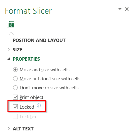 Sachez qu’il existe des options de verrouillage pour les segments (slicers) comme pour les cellules d’un fichier. Dans le menu de format du segment (slicer), il y a effectivement une cas à cocher pour déterminer si l’on souhaite que le segment (slicer) soit verrouillé ou non. Assurez-vous que cette case est décochée si vous souhaitez ajouter de la protection à votre onglet. Autrement, les utilisateurs de votre tableau de bord ne pourront pas faire de choix dans vos segments (slicers).