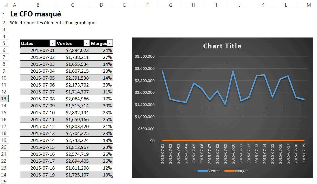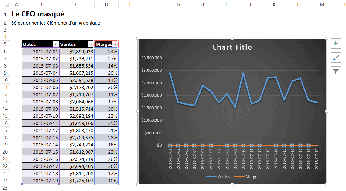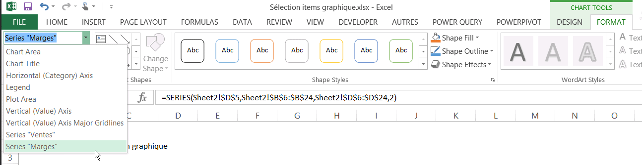 Mais que faire si vous avez du mal à sélectionner la série de données Marges? Vous pouvez tentez de cliquer dessus directement mais comme la série de données se superpose avec l’axe des X, il devient ardu de sélectionner la série de données et non l’axe comme tel.